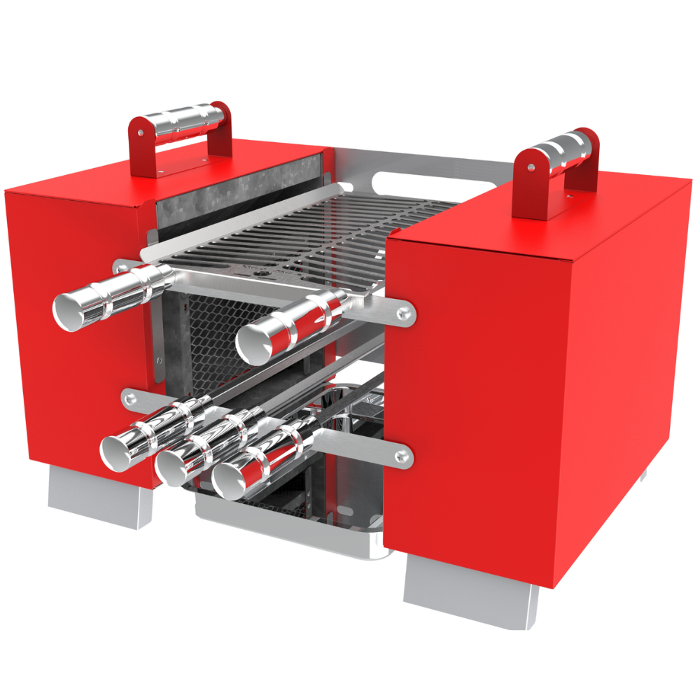 Hastes Frontais, Painel traseiro, Grelhas e espetos fabricados em INOX ESCOVADO.