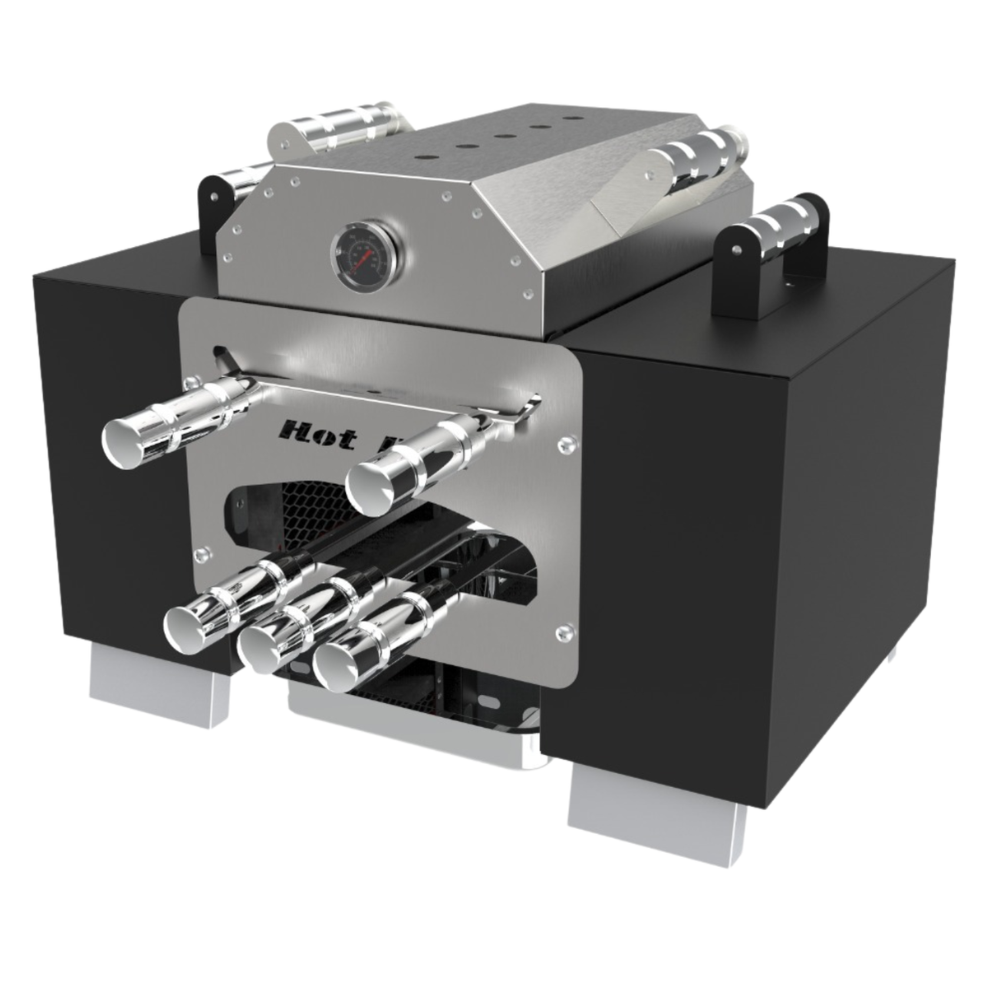A maior parte da fumaça gerada em churrascos vem da gordura da carne que cai sobre as brasas. A Hotbox possui caixas de queima de carvão nas laterais, enquanto o churrasco é assado entre os braseiros, no centro da churrasqueira. A gordura é coletada em uma bandeja com água, evitando a emissão de fumaça e garantindo o verdadeiro sabor do churrasco na brasa.